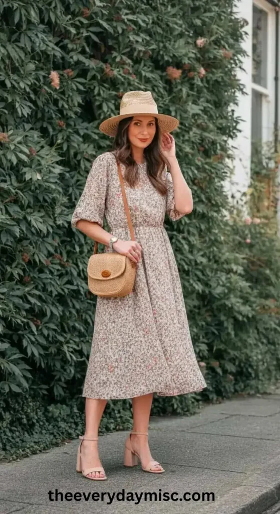 A wide-brim straw hat adds sun protection and style, and nude block heel sandals keep your feet comfortable and stable on the grass.