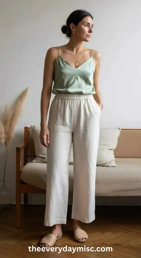 Wide-leg linen pants offer a stylish and airy feel. A silk camisole adds a touch of luxury and keeps you cool.