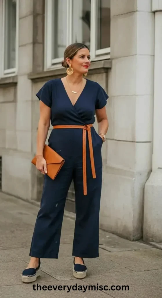A navy wrap jumpsuit looks elegant and allows easy movement.