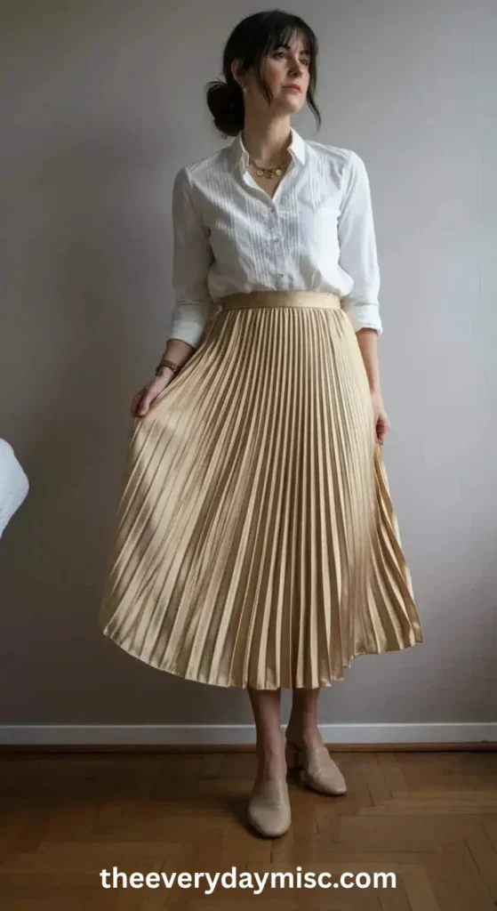 A metallic pleated skirt shines in the light. Pair it with a tucked-in cotton blouse.