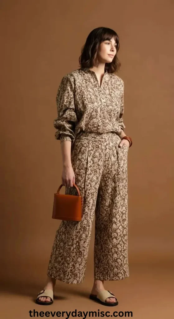 An earth-toned matching set gives a coordinated and stylish look.