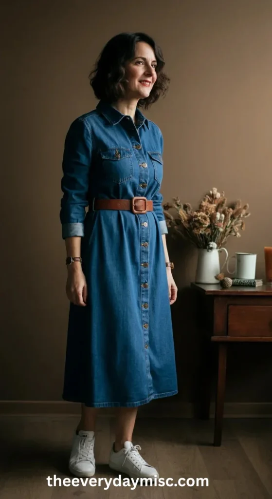 A structured denim dress gives a casual but elegant look.