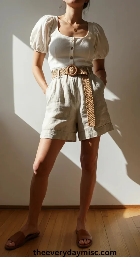 High-waisted linen shorts are comfortable and stylish.