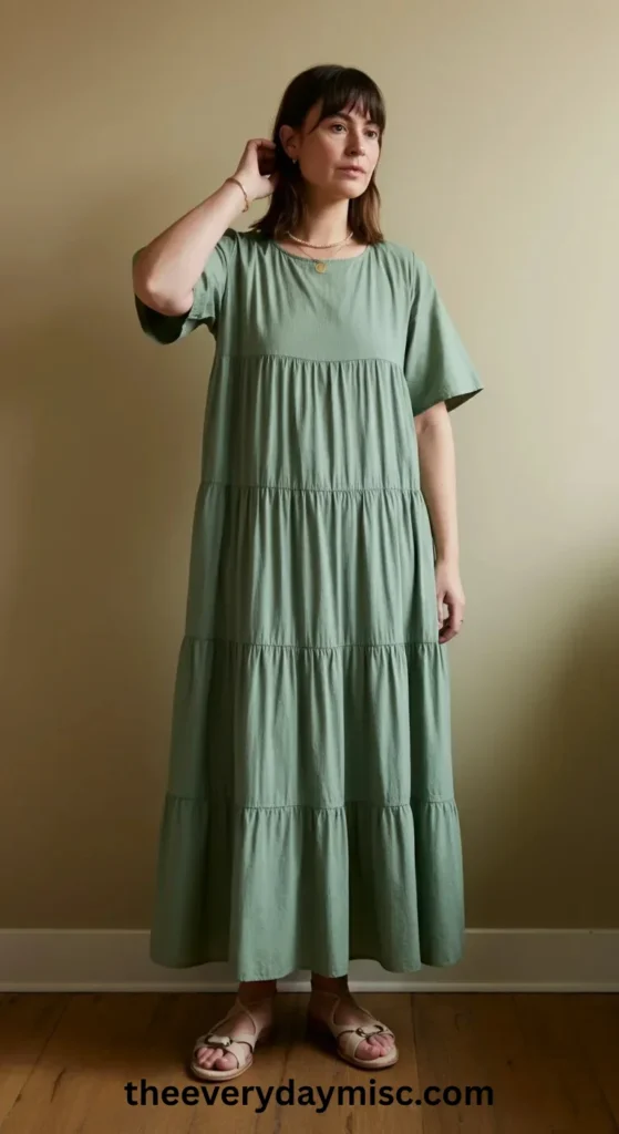 Layered delicate necklaces add interest, and flat sandals keep the outfit easy and relaxed.