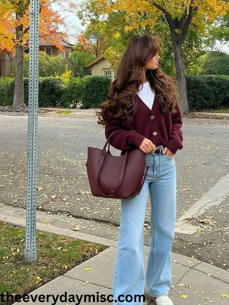Light-wash straight-leg jeans and white sneakers keep the outfit relaxed and easy to move in, while a matching burgundy tote bag brings the pieces together.
