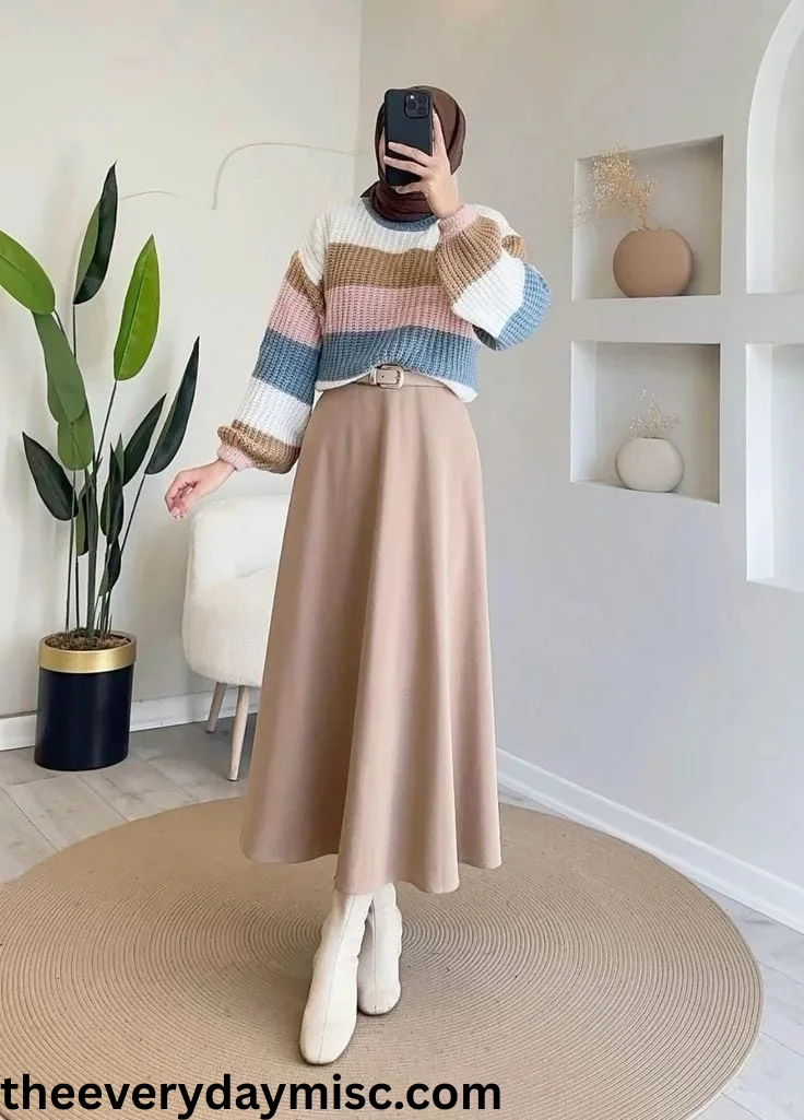 This winter church outfit mixes comfort and style in a simple, elegant way. A striped sweater in soft pastels and whites pairs with a flowing maxi skirt in neutral tones, creating a modest and polished look.