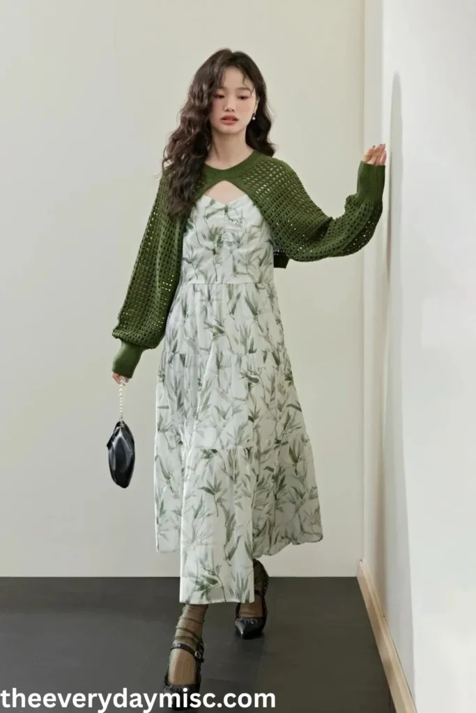 This winter church outfit blends warmth and elegance in a simple, graceful way. A cream floral midi dress paired with a forest green open-knit cardigan creates a modest and polished look.