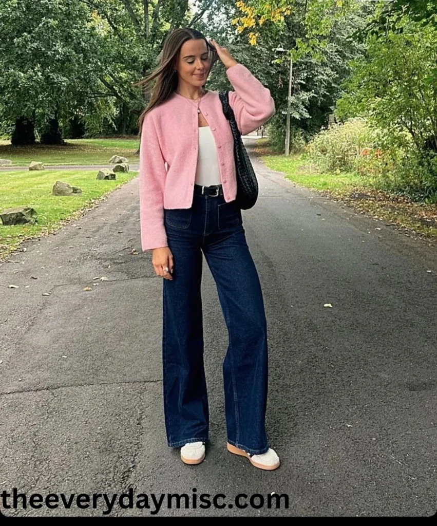 This winter church outfit pairs a soft pink cardigan with wide-leg dark denim for a warm and stylish look.