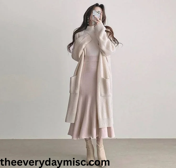 The knit fabric adds comfort for cold weather, and the outfit can be finished with simple accessories and neutral shoes for a clean and thoughtful appearance.