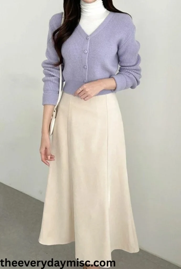 This winter church outfit blends comfort and elegance in a simple way. A soft lavender cardigan with a ribbed knit and buttons keeps the look warm, while a cream midi skirt adds a modest and clean shape.