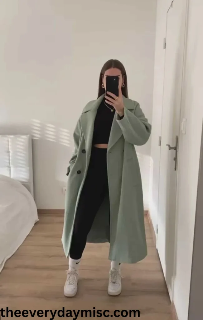 This winter church outfit mixes comfort and style in a clean, modern way. A flowing sage green coat adds a soft and calm look, while the oversized blazer style keeps it polished for church.