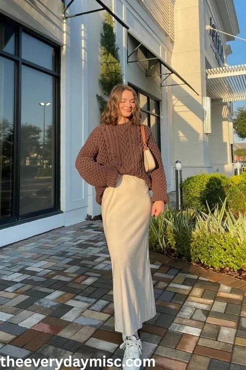 This winter church outfit blends warmth and style in a simple, thoughtful way. A rust-brown cable knit sweater adds texture and keeps you warm, paired with a cream midi skirt that feels modest and polished.