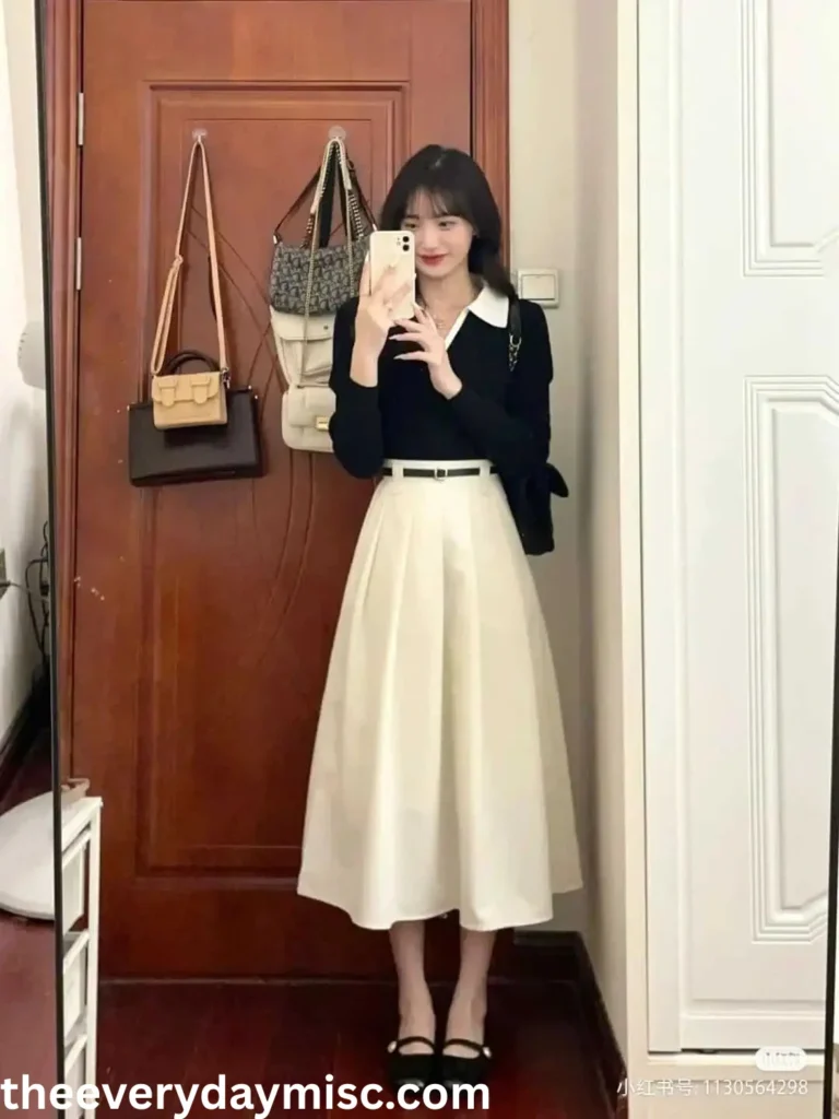 A cream midi skirt adds a soft and graceful touch while keeping the outfit appropriate. A matching belt shapes the waist, and black loafers with a structured handbag complete the look.