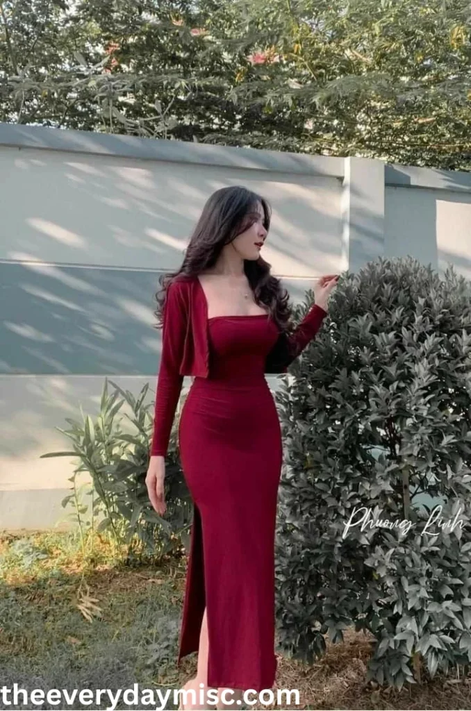 The square neckline and fitted shape make the outfit refined, while the long-sleeve cardigan adds comfort for colder weather. The rich burgundy color feels elegant and fitting for holiday or special Sunday services.