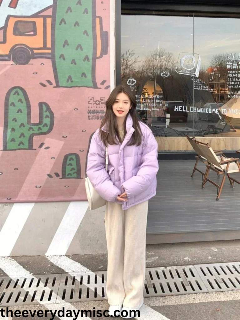 This winter church outfit blends comfort and simple elegance. A soft lavender puffer jacket adds warmth and a gentle touch of color, while cream-colored trousers and white sneakers keep the look modest and polished.