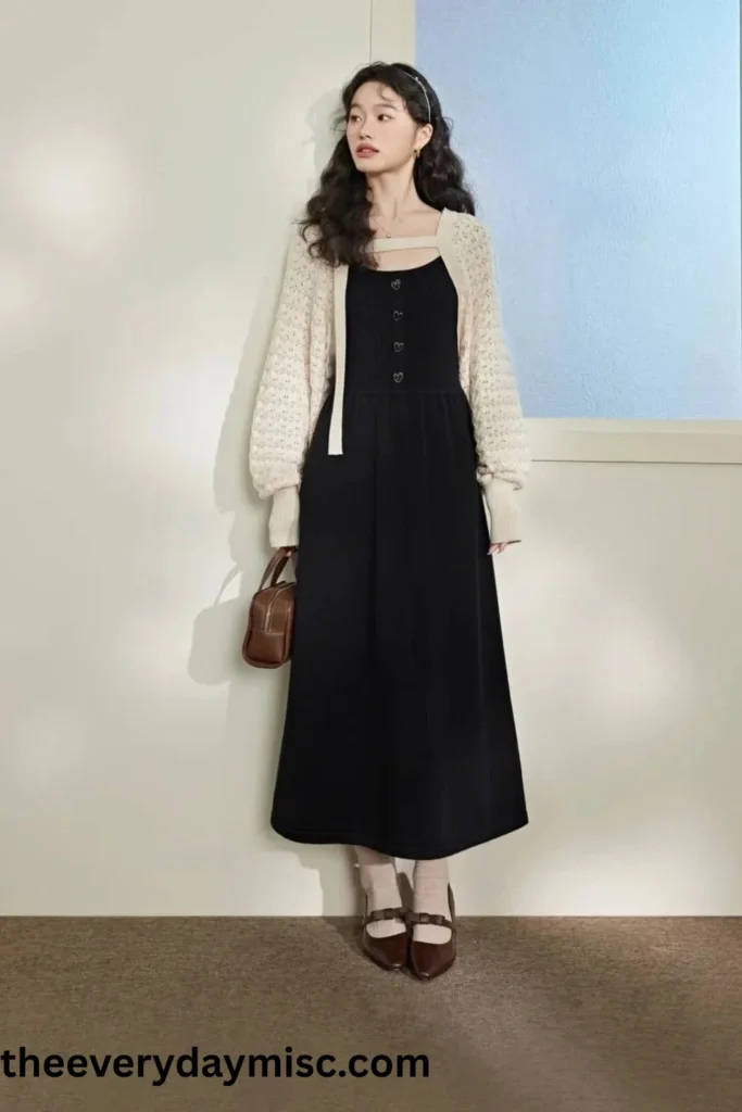 This winter church outfit mixes warmth and classic style in a simple, elegant way. A black midi dress with heart-shaped buttons keeps the look modest and polished, while a cream cable-knit cardigan adds cozy warmth.
