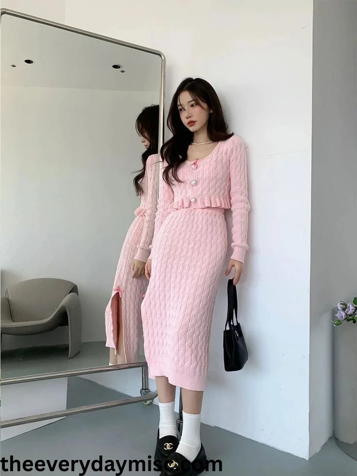 This winter church outfit combines comfort and simple elegance. A pastel pink quilted knit dress with a cropped peplum top and pearl buttons adds a feminine touch, while the fitted midi skirt keeps the look modest.