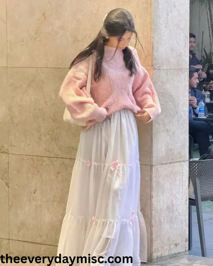 This winter church outfit combines warmth and simple elegance. A soft pink ribbed sweater keeps you cozy while looking neat, and a white maxi skirt with pink accents adds a modest, graceful touch. The flowing skirt adds movement, while the sweater keeps the look polished.