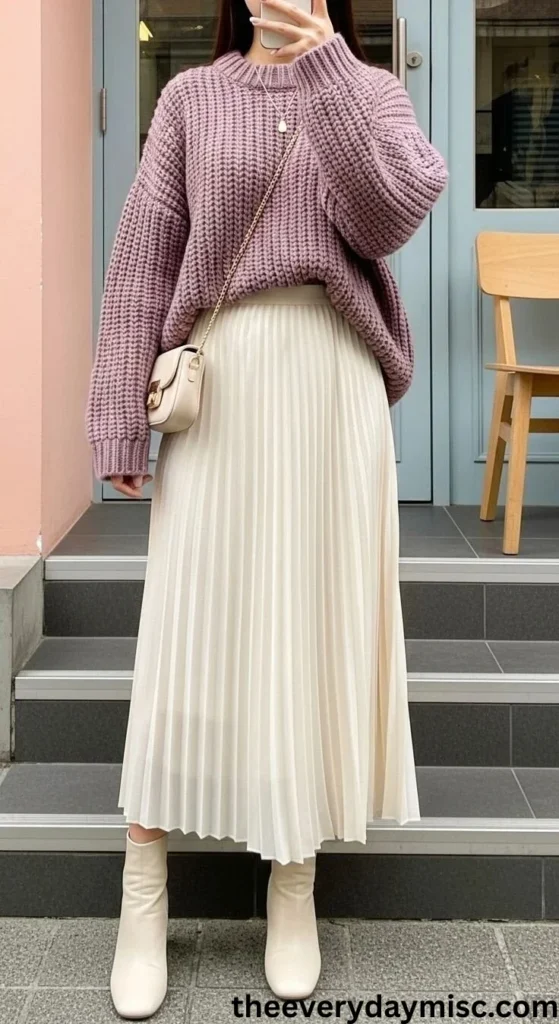 This winter church outfit blends warmth and elegance in a simple, polished way. A mauve knit sweater keeps you cozy, paired with a cream pleated midi skirt for a modest, graceful look.