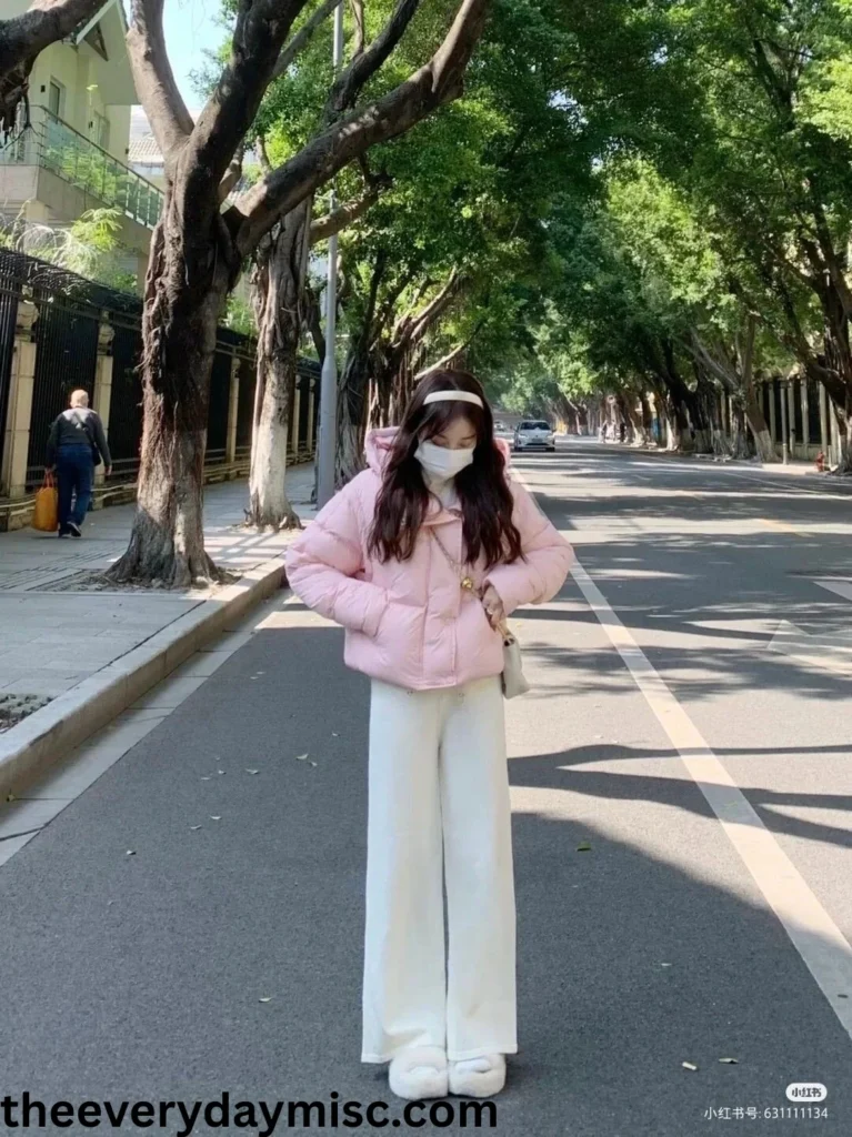 This winter church outfit mixes warmth and simple elegance. A soft pink quilted puffer jacket keeps you cozy, paired with cream-colored wide-leg pants for a polished, modest look.