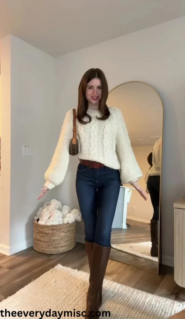 This winter church outfit blends warmth and simple elegance. A cream cable-knit sweater keeps you cozy while looking polished, paired with dark denim and brown knee-high boots for a balanced, modest look.