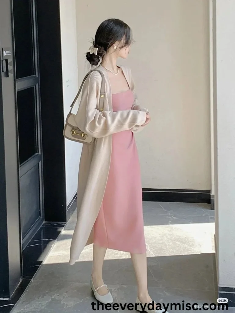 This winter church outfit blends warmth and simple elegance. A soft pink midi dress provides a modest, flattering base, while a cream oversized cardigan adds cozy layering.
