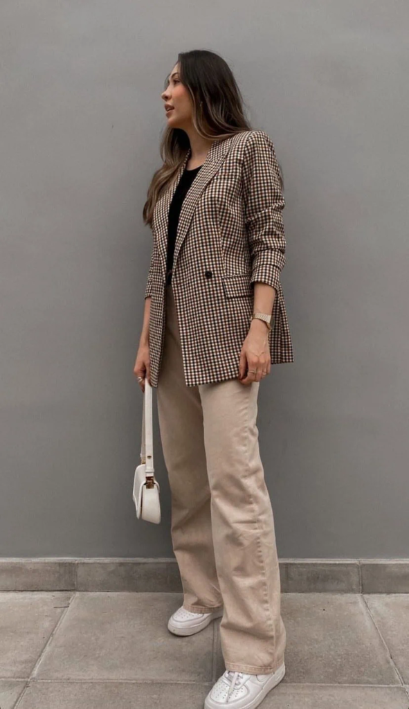 A checkered blazer adds interest without being too bold. Paired with neutral wide-leg trousers, the outfit feels balanced and polished.